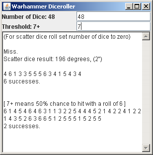 This small utility allows the user to roll multiple 6-sided dice and see how many are higher than the given threshold. It also allows the user to roll scatter dice when needed. Designed for the Warhammer tabletop wargaming system.